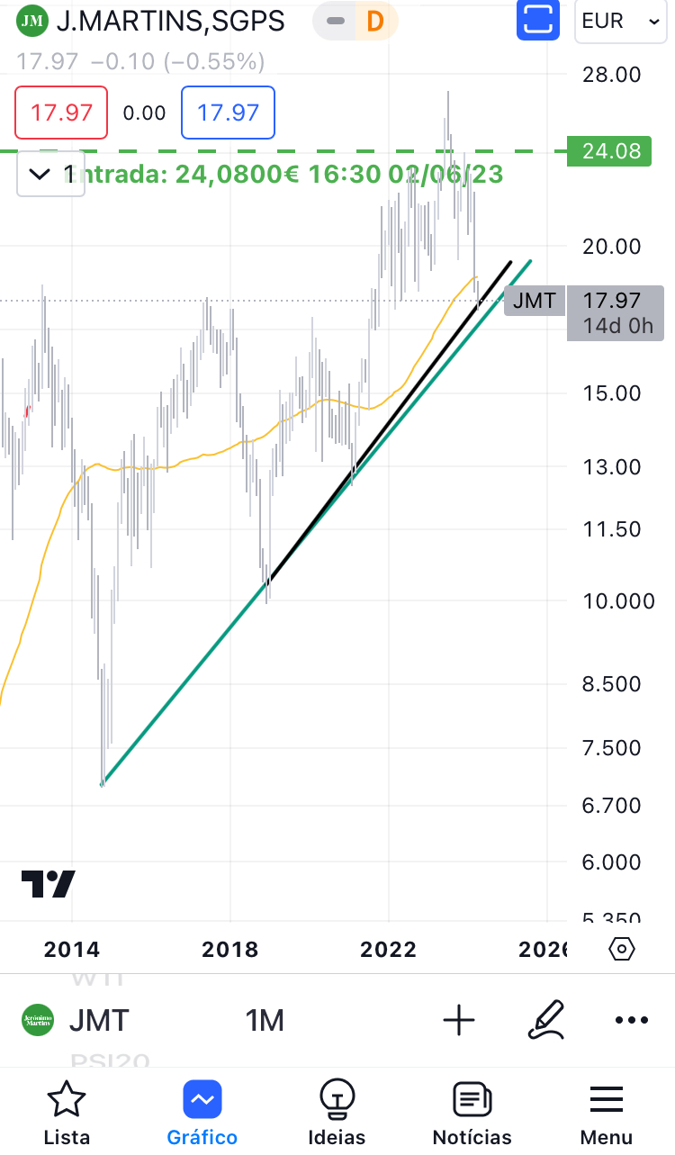 A Jerónimo Martins teve uma descida que não esperava, mas talvez reaja em breve numa destas linhas de suporte e recupere. Veremos este mês e no próximo
