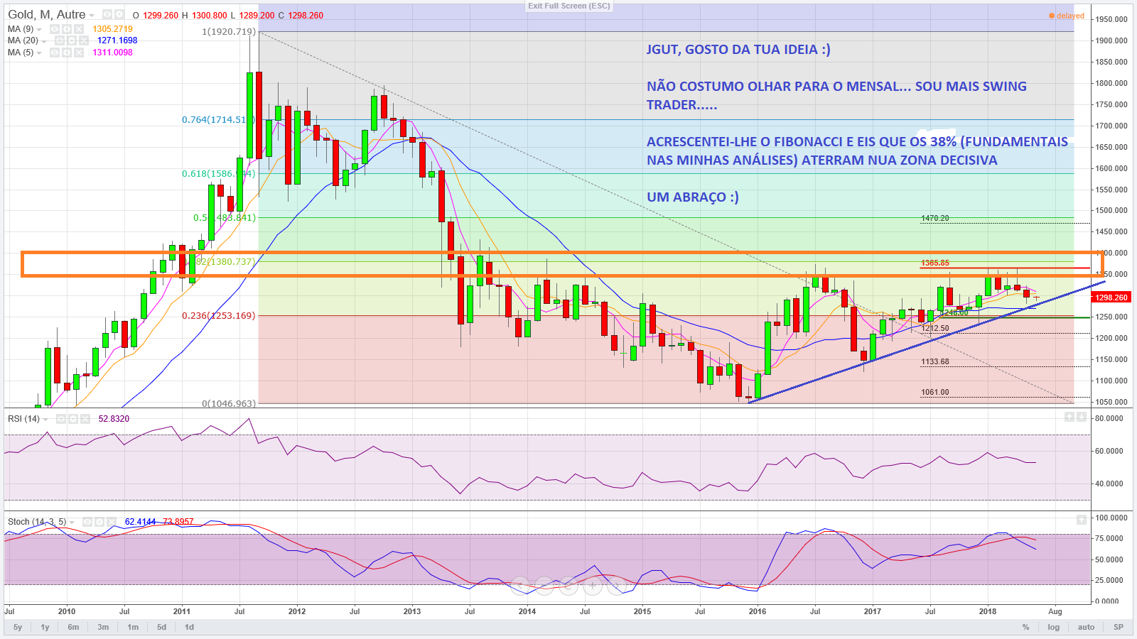 Brincadeira à parte, eu tenho esta ideia para o ouro,.... no mensal, dos dados que disponho, desde 2002 que assistimos a uma subida mais ou menos constante e continua. Após os máximos assistimos em 2015 à sua correção em 50% desse movimento de subida... se assistimos a uma w2 composta...não sei, mas vejo a zona dos 1400 como decisiva para o teste aos máximos, os quais, se rompidos atiram o target para os 2700... será??