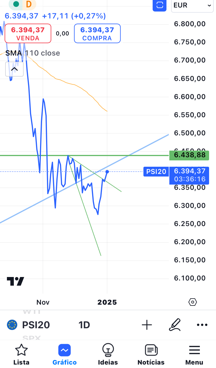 O PSI atingiu o objetivo da cunha. É uma cunha importante porque provavelmente vai marcar a inversão de tendência da bolsa portuguesa. Neste momento, o PSI também já ultrapassou o fecho de novembro, o que é também um sinal positivo.