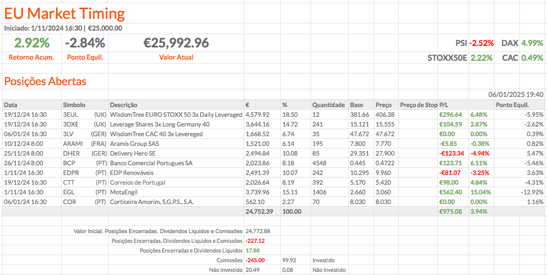 A carteira subiu 9,29% desde a última avaliação em 15/12/2024 (de -1,90% para 7,39%), ampliando a vantagem sobre o índice PSI para +7,97%.