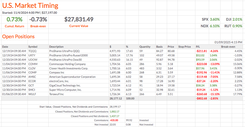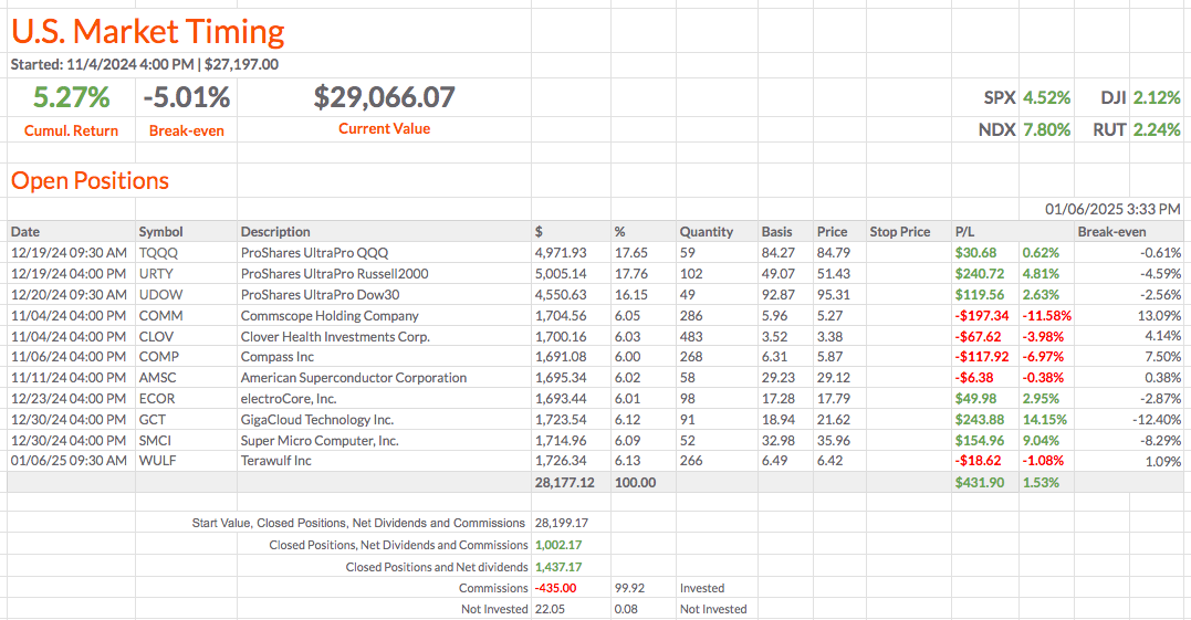 A carteira subiu 7,62% desde a última avaliação em 15/12/2024 (de -2,09% para +5,53%), ampliando a vantagem sobre o índice SPX de -8,01% para +0,56%.