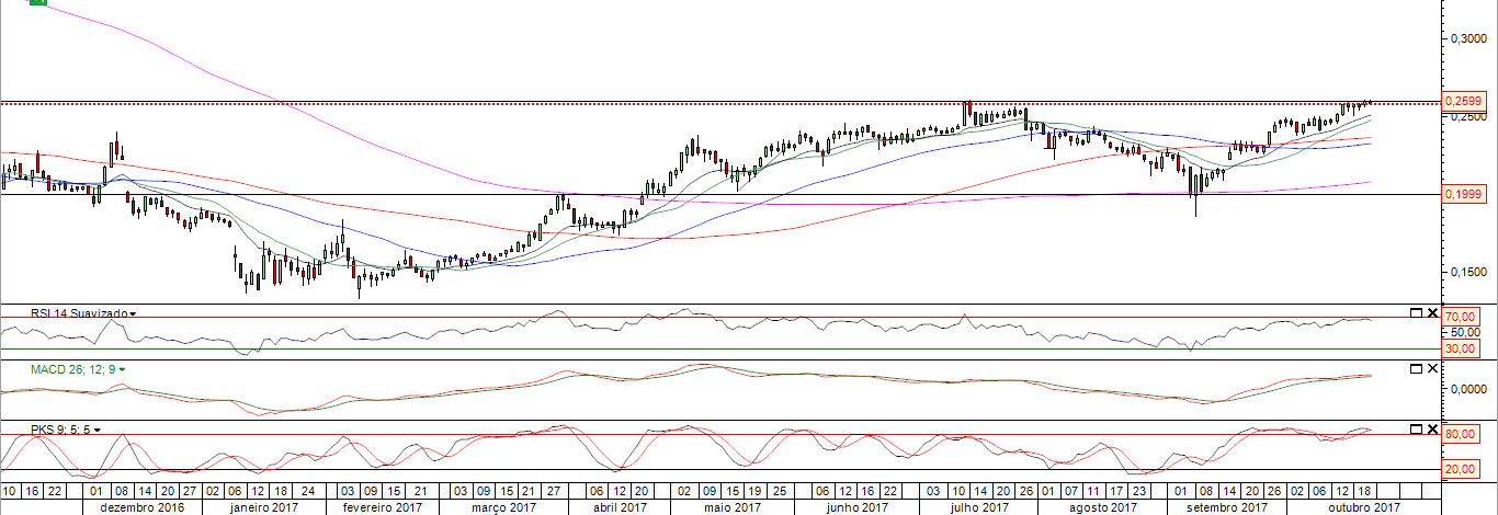 A cotada continua a lateralizar entre os 0,25 e os 0,26 ganhando fôlego para tentar passar o que parece ser uma grande barreira nos 0,26.