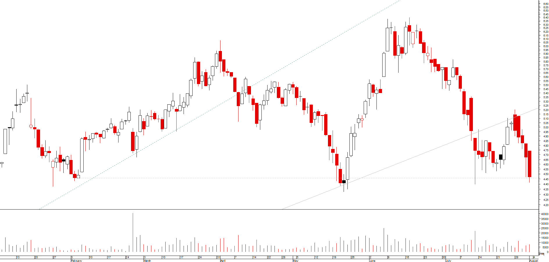 Ontem pensei que ia recomeçar as subidas, mas ao longo do dia perdeu a força e hoje voltou praticamente ao suporte no casa dos 4.4x- 4.5x...