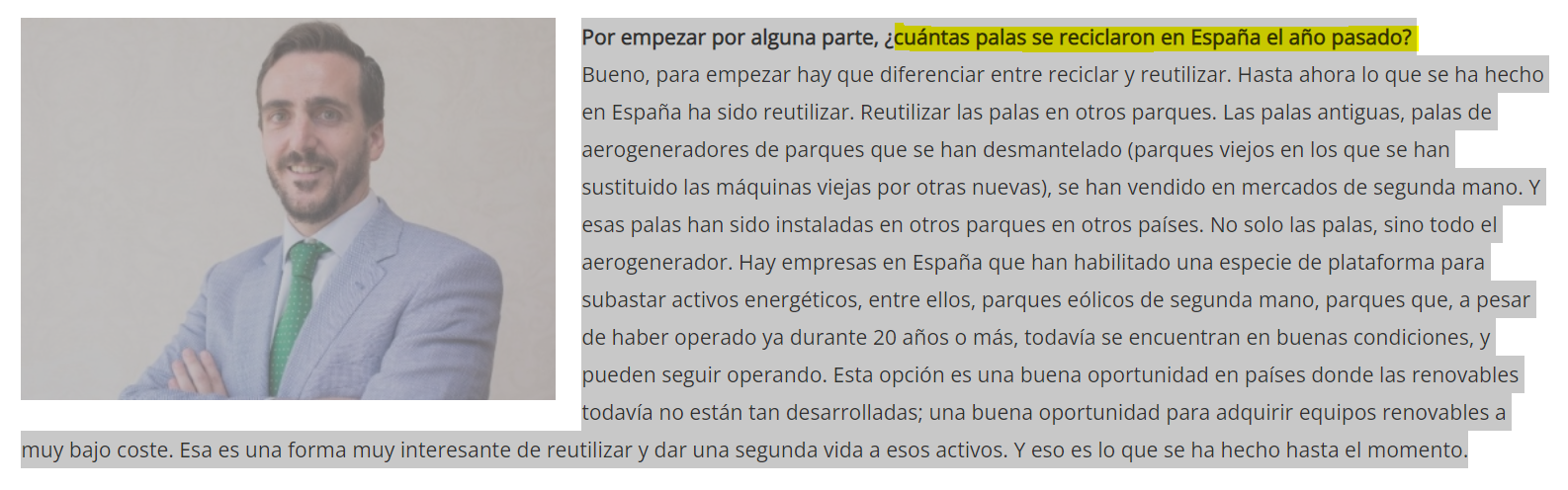 Uma empresa pensada para reciclar pás eólicas, transformou-se, sem querer, numa empresa de compra e venda de pás eólicas em segunda mão.