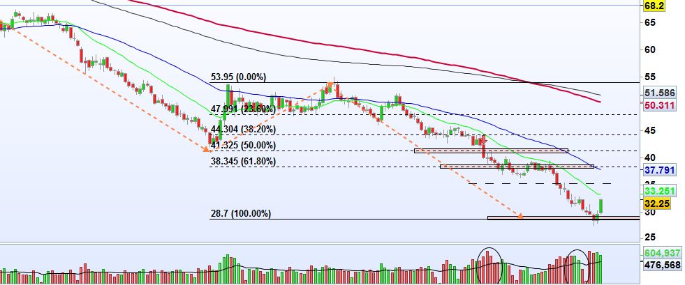 Entrada a comprar assim que o mercado abrir. Se subir mais de 2usd vende-se. Se descer para 29 reforça-se para vender ao preço da primeira entrada. O Stop anda sempre nos minimos da semana passada.