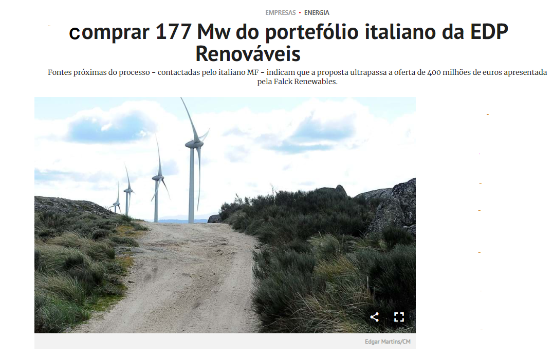 A publicação indica - citando fontes próximas do processo - que a oferta ultrapassará a proposta de 400 milhões de euros que já tinha sido apresentada pela Falck Renewables.