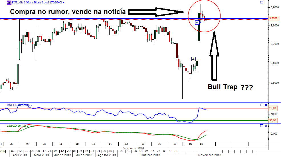 A bull trap que deixei como interrogação no último gráfico acabou por não se confirmar, os 3,84 acabaram por servir de suporte no intraday da última sessão, rompeu, fez pull back e voltou aos máximos e isso foi positivo para os touros.