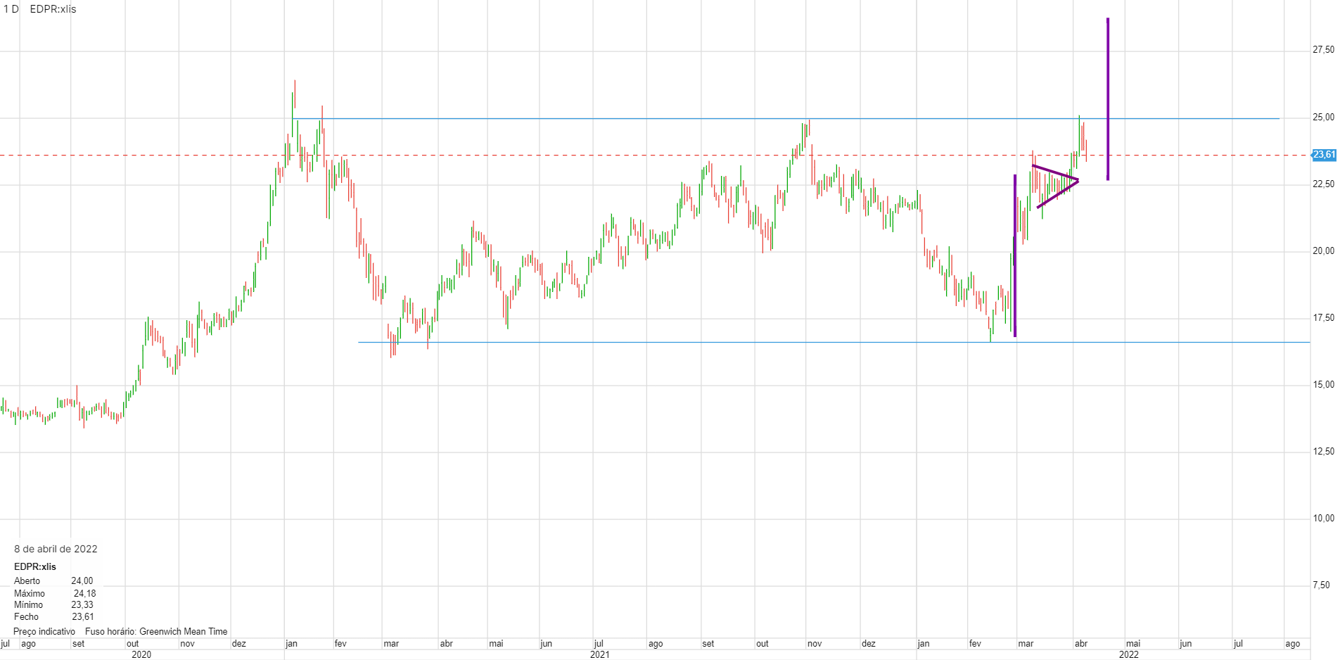 Situação interessante na EDPR. Uma figura de consolidação que, se quebrada em alta, projeta o preço para a zona dos 29€.