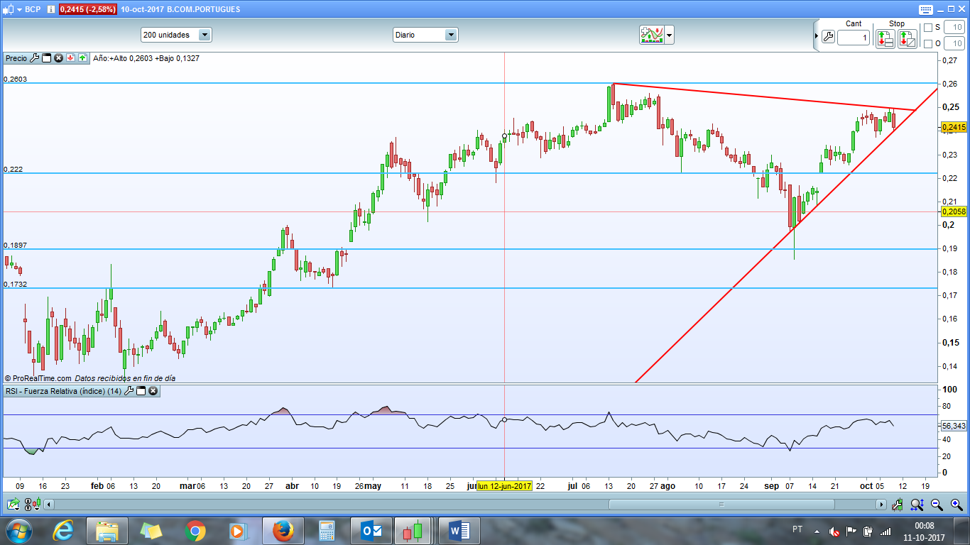 A minha perspectiva para o BCP: anda desde Setembro a subir calmamente. Não teve reacções especulativas a nenhum dos eventos que mencionaste como teve a outros eventos no passado. Nem Catalunha nem Novo Banco fizeram as cotações mexer para fora da tendência: calma e ascendente.