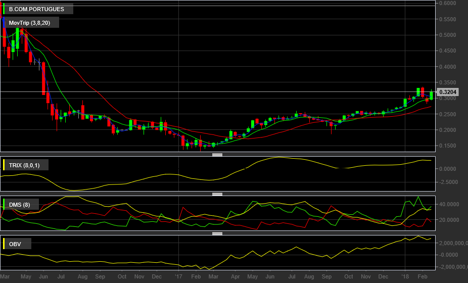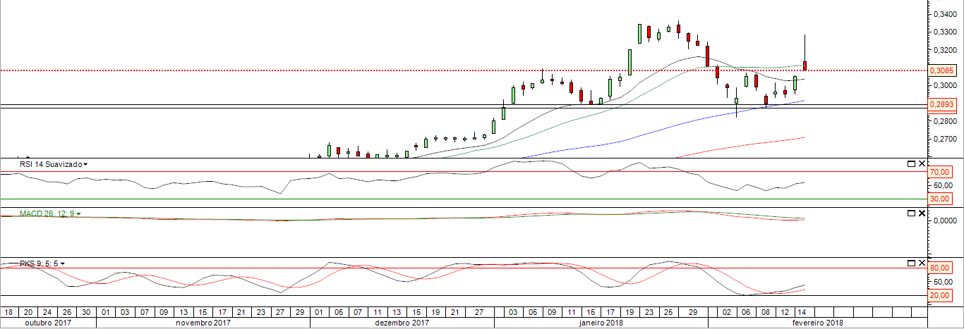 Em complemento a esta analise fundamental, proponho que o movimento de hoje apenas se deve a uma quebra em alta do anterior maximo relativo nos 0.3067 de 07/02/2018 o que validou uma figura de duplo fundo relativo com o minimo relativo mais alto nos 0.2870 a 09/02/2018. Assim sendo a validação da figura tinha como alvo minimo: 0.3067*0.3067/0.2870 = 0.3277.