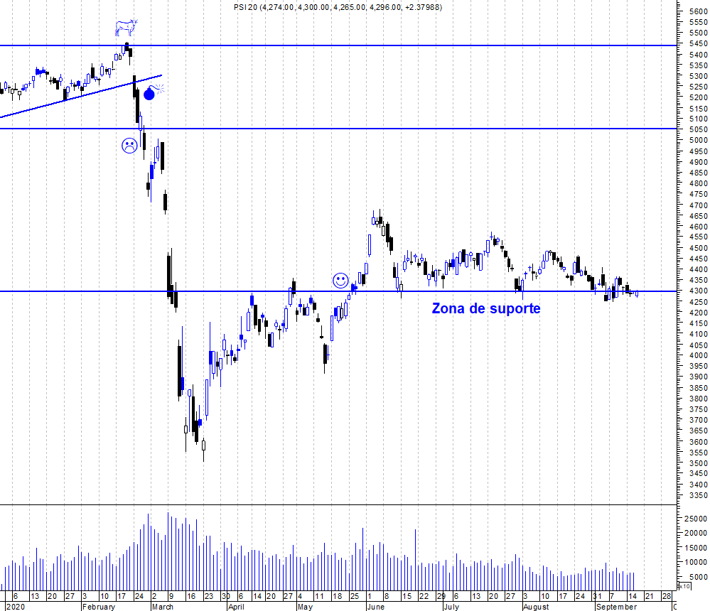 O PSI continua sob um efeito quase magnético da zona de suporte dos 4300 pontos. Reparem que, por exemplo, o mercado norte-americano nas últimas 2 semanas teve sessões com variações bem fortes e o PSI mantém-se quase inalterado. Isto realça a importância do suporte mas também os riscos do que a sua quebra pode significar caso aconteça.