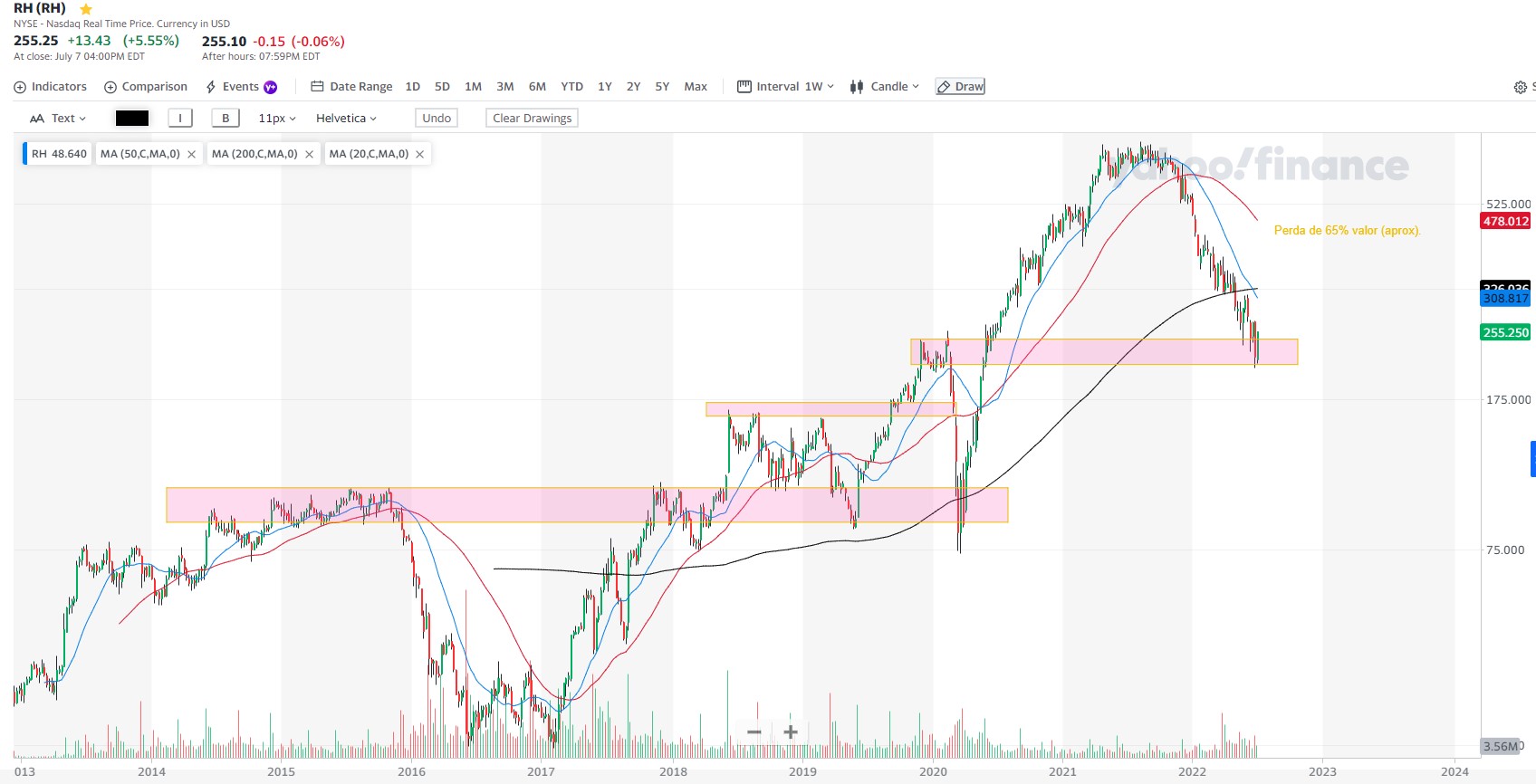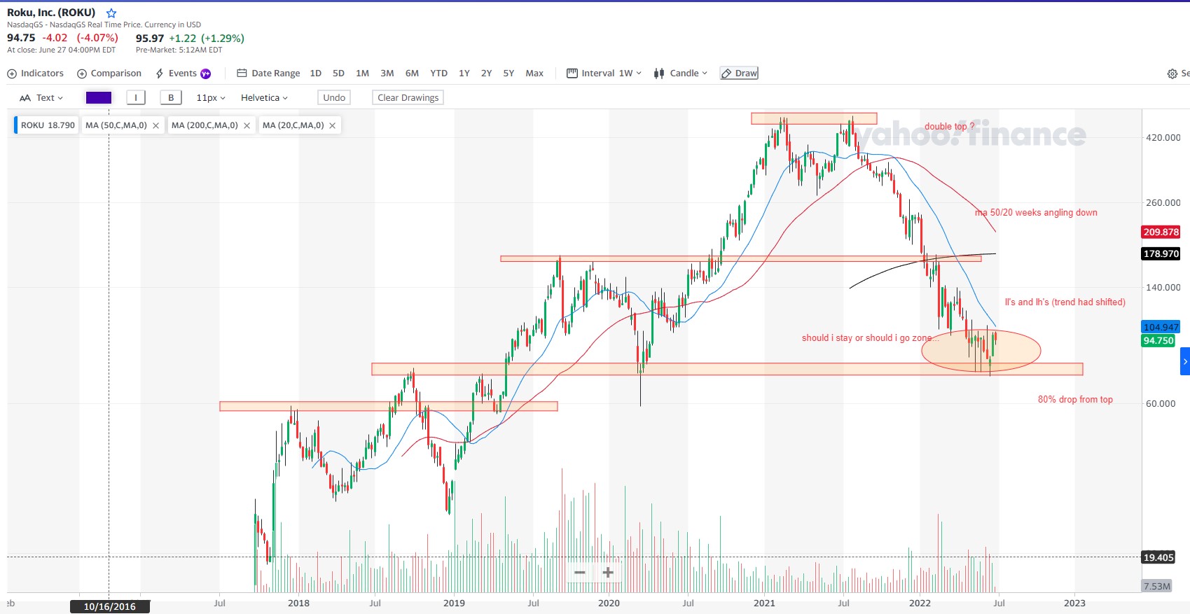A ROKU fez um aparente duplo topo no primeiro semestre de 2021 e desde essa fase para cá perdeu cerca de 70-80% do seu valor.