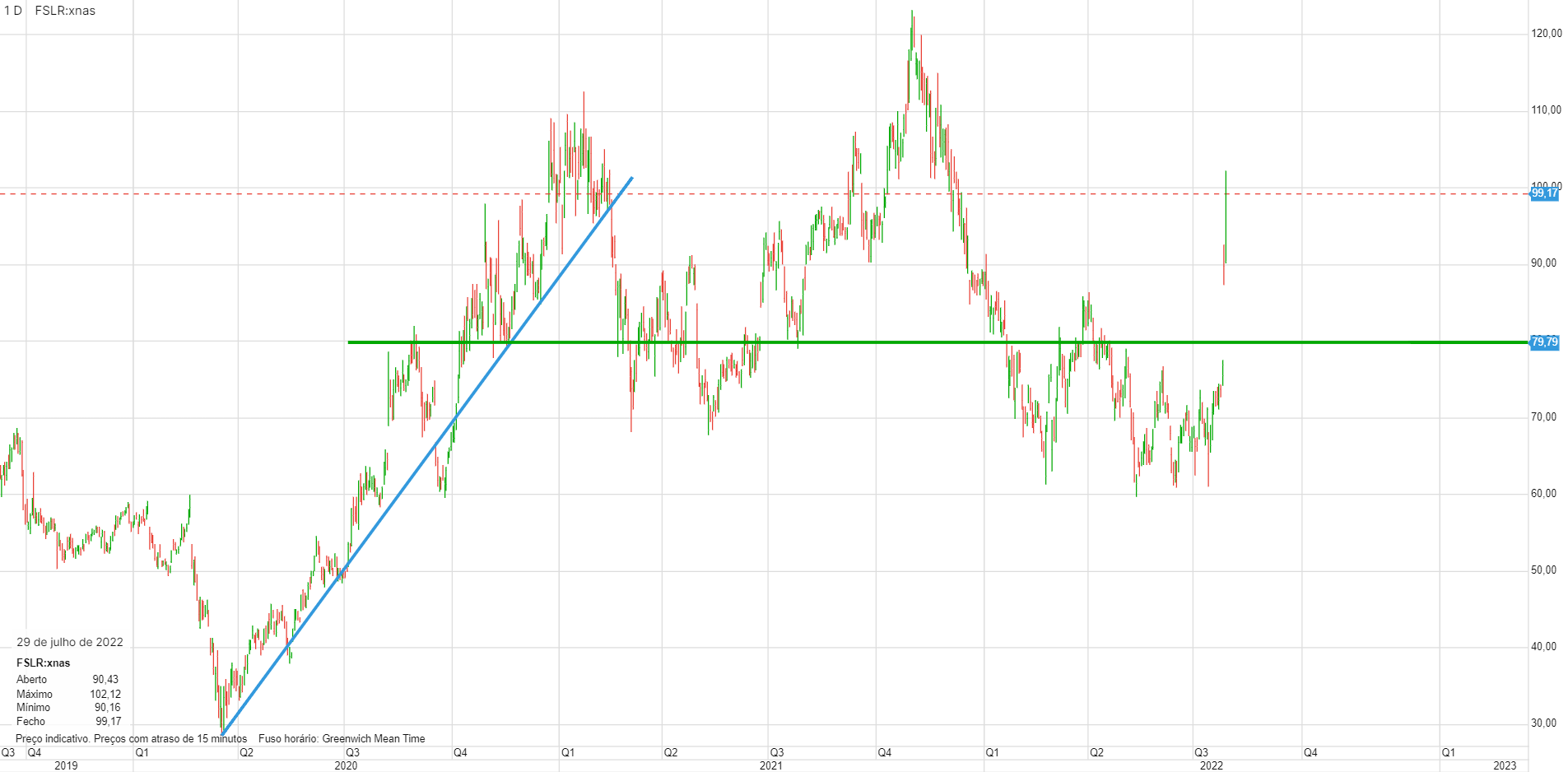 A First Solar, uma ação que comprei há uns meses largos a 100 e que esta semana deu um ar da sua graça. Apesar de ter comprado a 100, já estou a ganhar mais de 10% devido às variações cambiais...