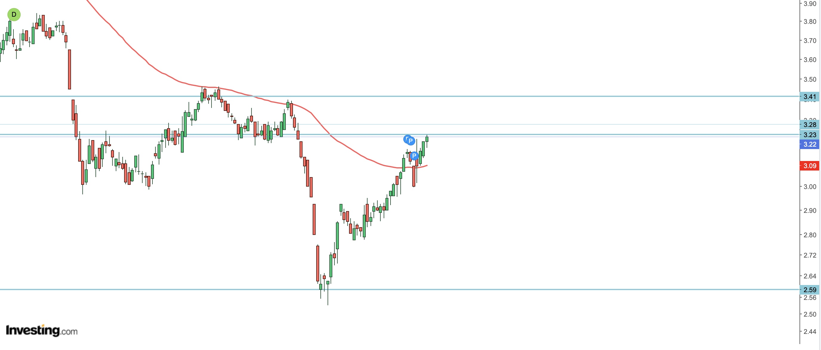 Entretanto, o estocástico está a entrar em zona de venda no gráfico semanal. E no diário a média móvel de curto prazo, já quebrou em baixa a média móvel de médio prazo. O caminho abaixo dos 3 eur, pode estar traçado, mas como em tudo nos mercados, as certezas podem sair pela culatra.