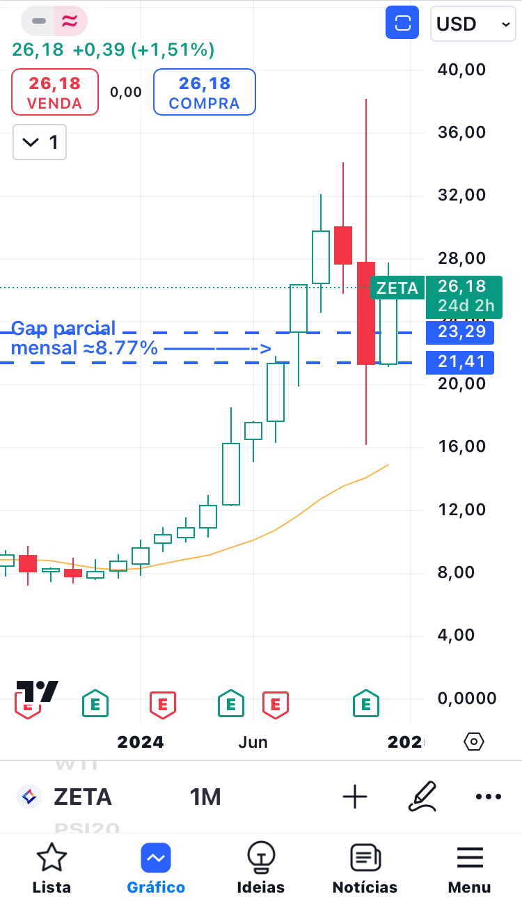 Em abril, a ZETA abriu o mês com um gap up superior a 8%. Subiu bastante e deixou o gap visível. Meses mais tarde, teve uma grande correção e acabou por tapar o gap.