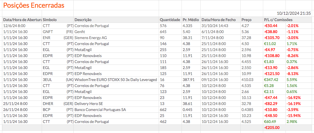 A carteira desceu 0,72% desde 06/12/2024 (de -1,18% para -1,90%), mantendo-se acima do índice PSI, mas diminuindo a diferença em -0,99%.