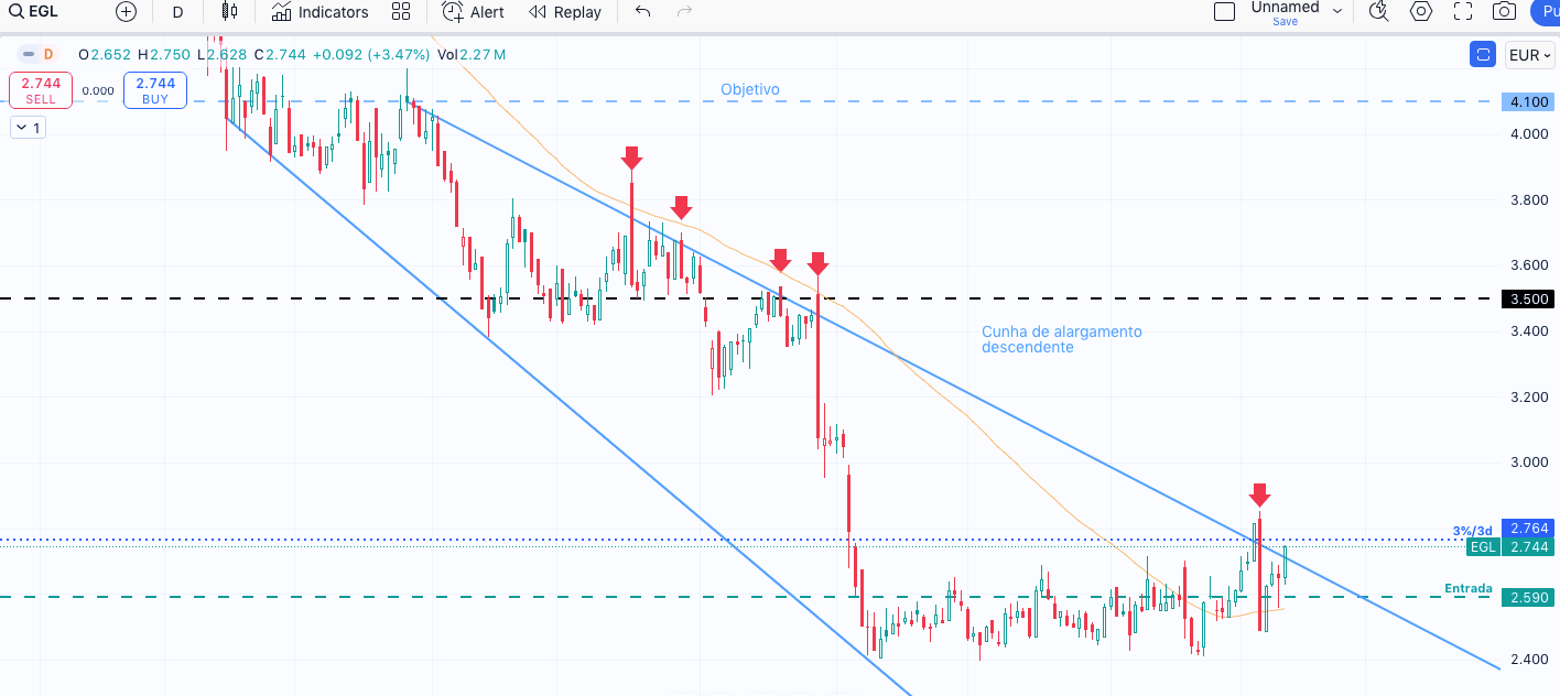 A EGL está num ponto importante. Se não descer amanhã, será a primeira vez desde maio que não desce depois de abrir acima da linha de resistência descendente como provavelmente vai abrir amanha. Nas últimas 5 vezes, desceu sempre. Mesmo que desça, vou continuar acreditar que vai subir até ao objetivo da cunha, mas este é um ponto relevante, considerando o histórico.