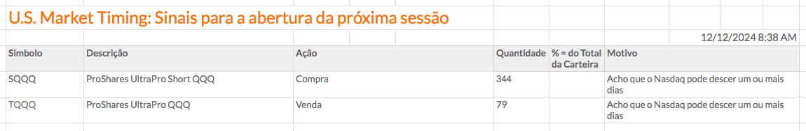 Vou abrir a minha primeira posição short desde o início das carteiras. Não vou sair das ações, por isso vou estar longo e curto ao mesmo tempo. Vou arriscar um pouco, porque é contra a tendência e não tenho uma justificação muito sólida, porque tenho dúvidas, mas acho que o Nasdaq pode descer um ou mais dias e voltar para onde fechou na quarta feira.
