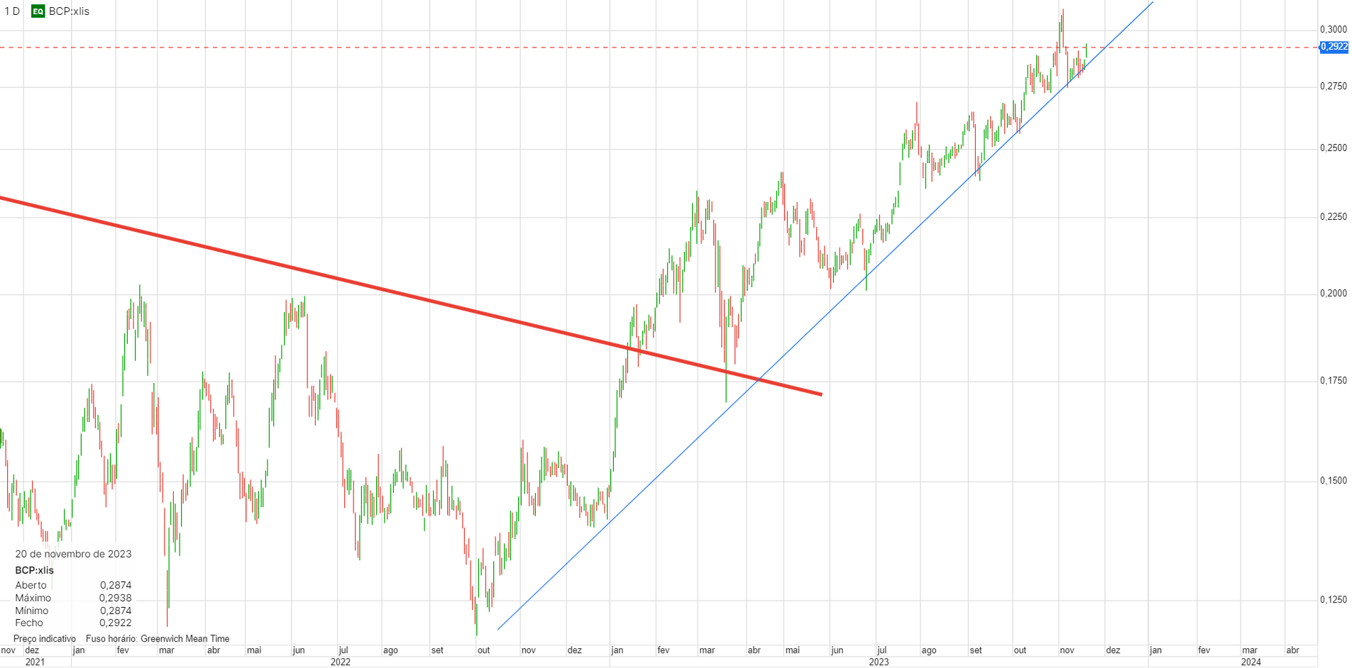O BCP com a promessa de distribuição de dividendos e os bons resultados continua animado. Aqui, como na bolsa em geral, o risco está na política. Se o PS eleger Nuno Santos teremos sérias dificuldades económicas de novo. A bipolarização de dois blocos políticos não augura nada de bom. Toda a recuperação poderá ir para o galheiro. :shock: