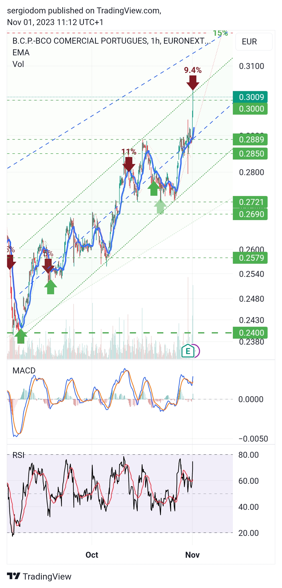 se me recordo bem, uma das regras do Arlos era vender aos 10%. neste contexto parece-me acertado, dado que na escala horaria o RSI começa a entrar em sobrecompra. se a cotada descer ate ao fundo do canal (o que só aconteceu uma vez), isso abria portas a novo salto de 11% até aos 29.50.