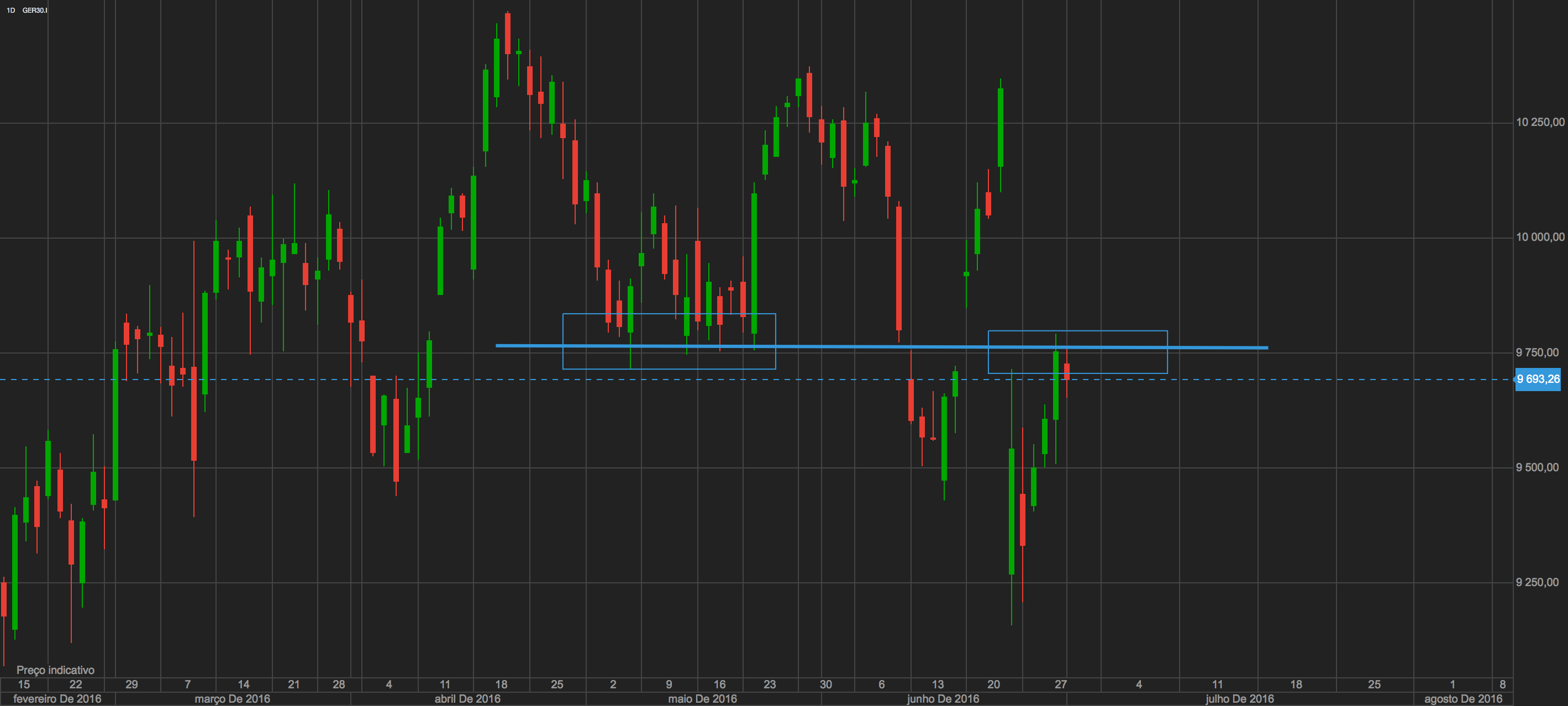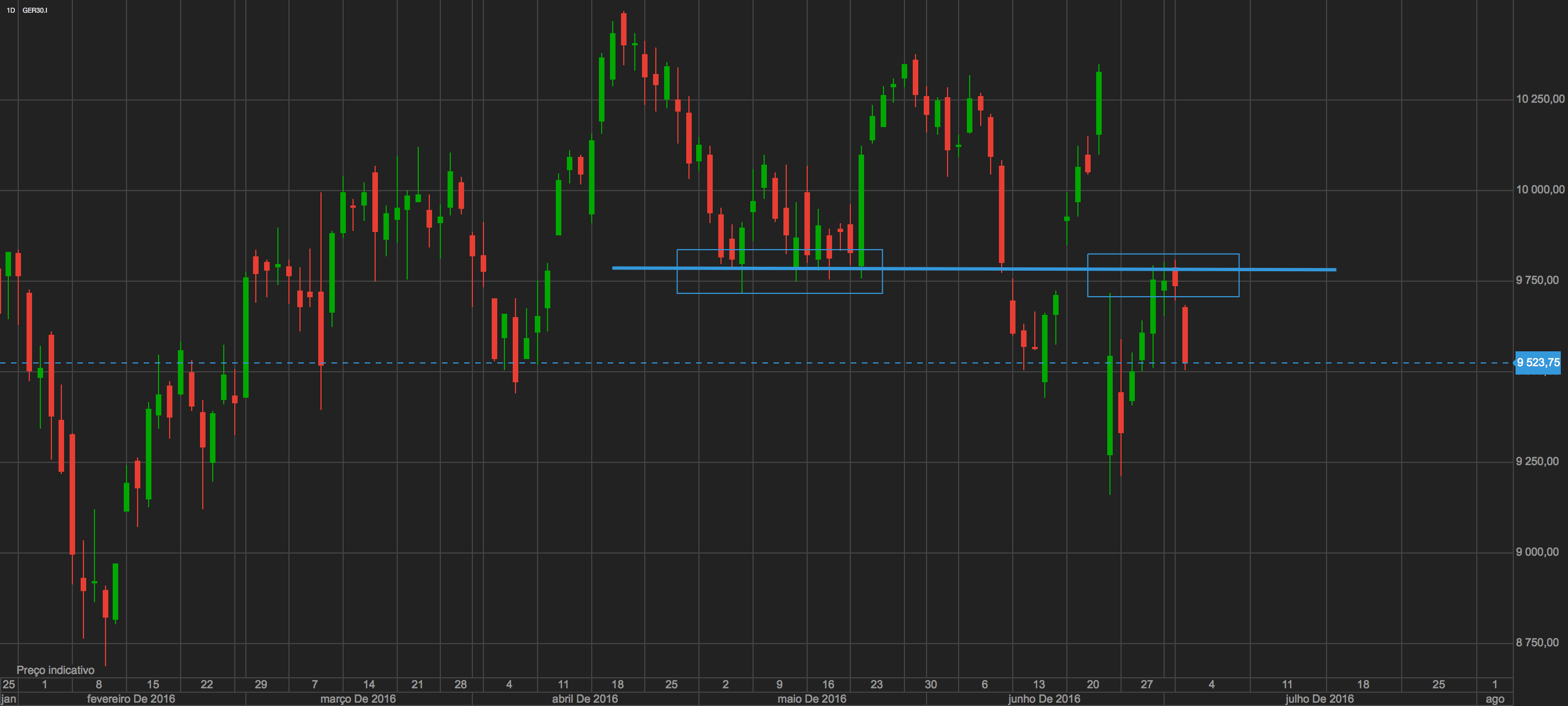 O que faz sentido para mim neste momento durante o mês de Julho , é o DAX ir testar novamente o importante suporte dos 9500.