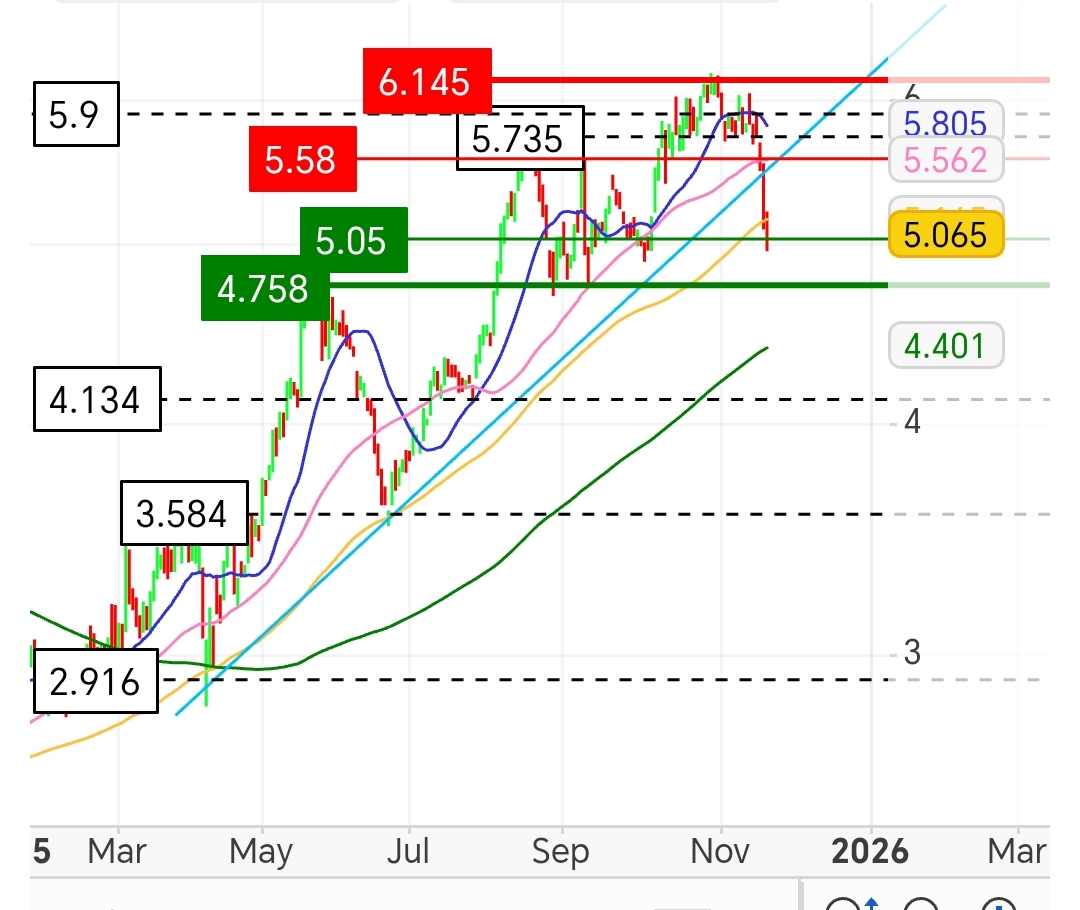 A quebra da LTA que vinha desde Setembro, pode levá-la a visitar a zona dos 4,5€, que é o target deste trade. Stop nos 5,5€