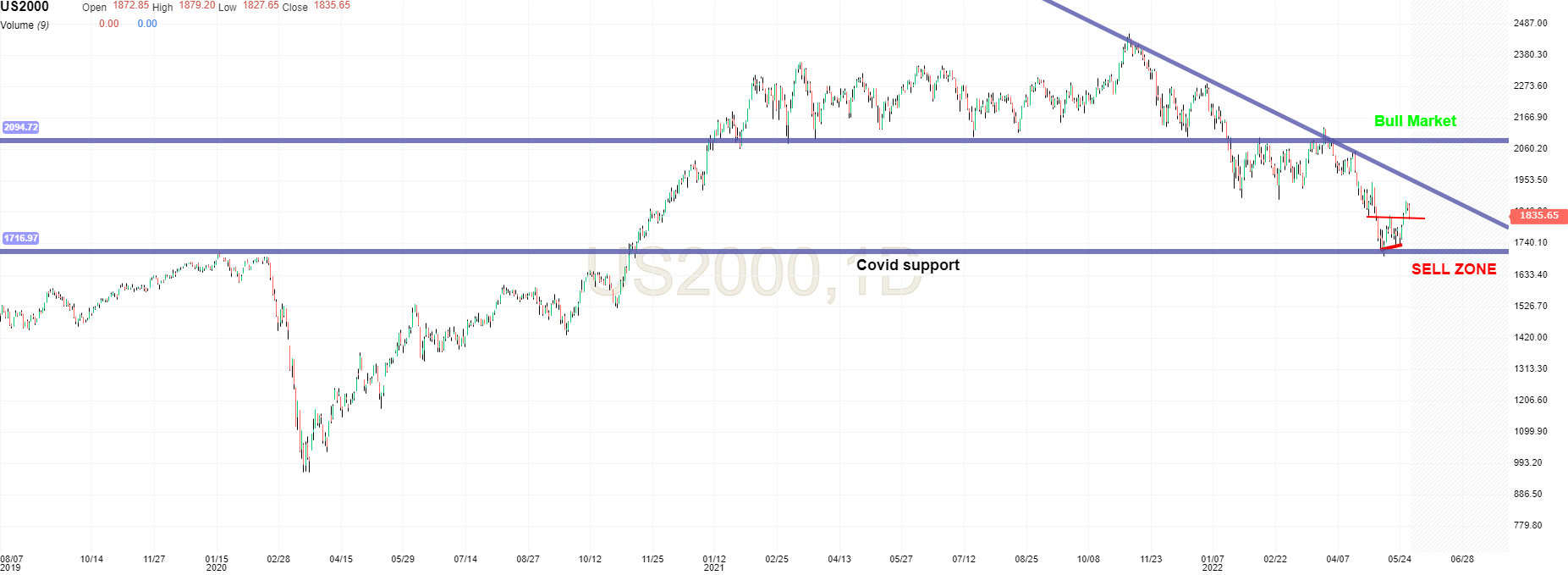 Se quebrar o suporte será um bom ponte de entrada para os bears. A região de bull market parece estar bem identificada.
