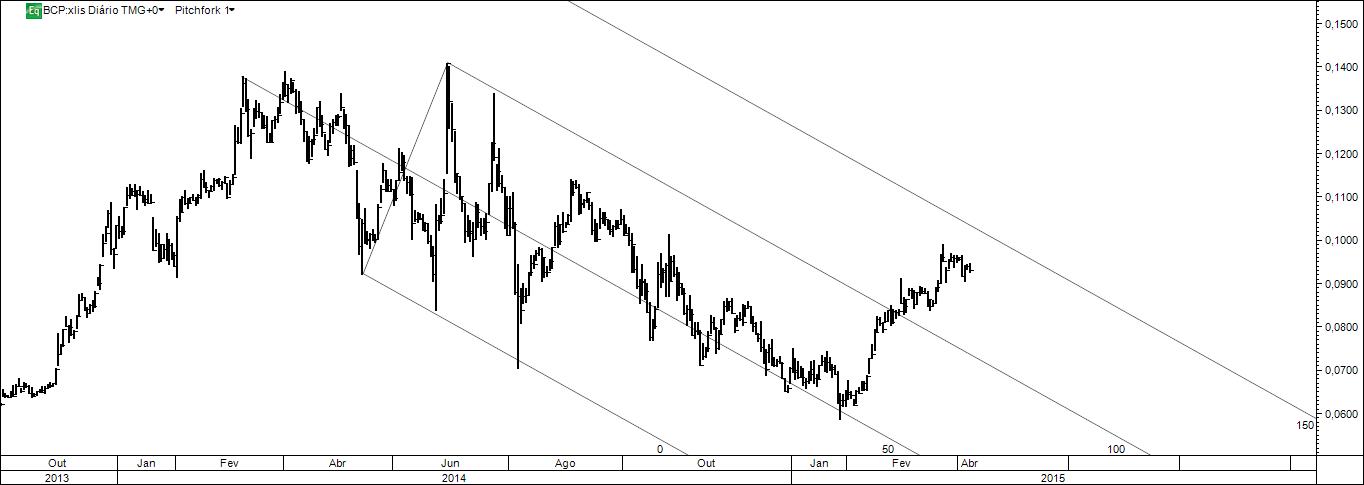 Por regra sou reservado nas análises quanto ao nosso mercado. Tenho intervindo a título excepcional, principalmente para destacar uma ou outra coisa que me pareça interessante. Foi o que aconteceu com o BCP e com o psi20 e disso fiz menção em recente intervenção no tópico deste a propósito de uma análise feita pelo hjor e, quanto ao BCP, por causa de uma eventual área que me pareceu interessante para comprar (mas isto foi "há 60% atrás"). Deixo aqui um gráfico do BCP que já havia colocado antes. Relativamente ao psi20, concordo com a leitura feita pelo hjor no seu último video, ou seja, estamos perante uma área que pode apresentar resistência como, aliás, outros foristas também referem (parece-me que o próprio Ulisses comunga igualmente da ideia de uma resistência), não sendo muito relevante saber se são "50 pontos mais acima ou mais abaixo". A única diferença que vejo em relação à opinião de todos aqueles é que, seguindo a doutrina da minha escola de pensamento, o bull já começou. Esta circunstância, contudo, não legitima que se compre desde já pois tenho por princípio comprar correcções em bull.