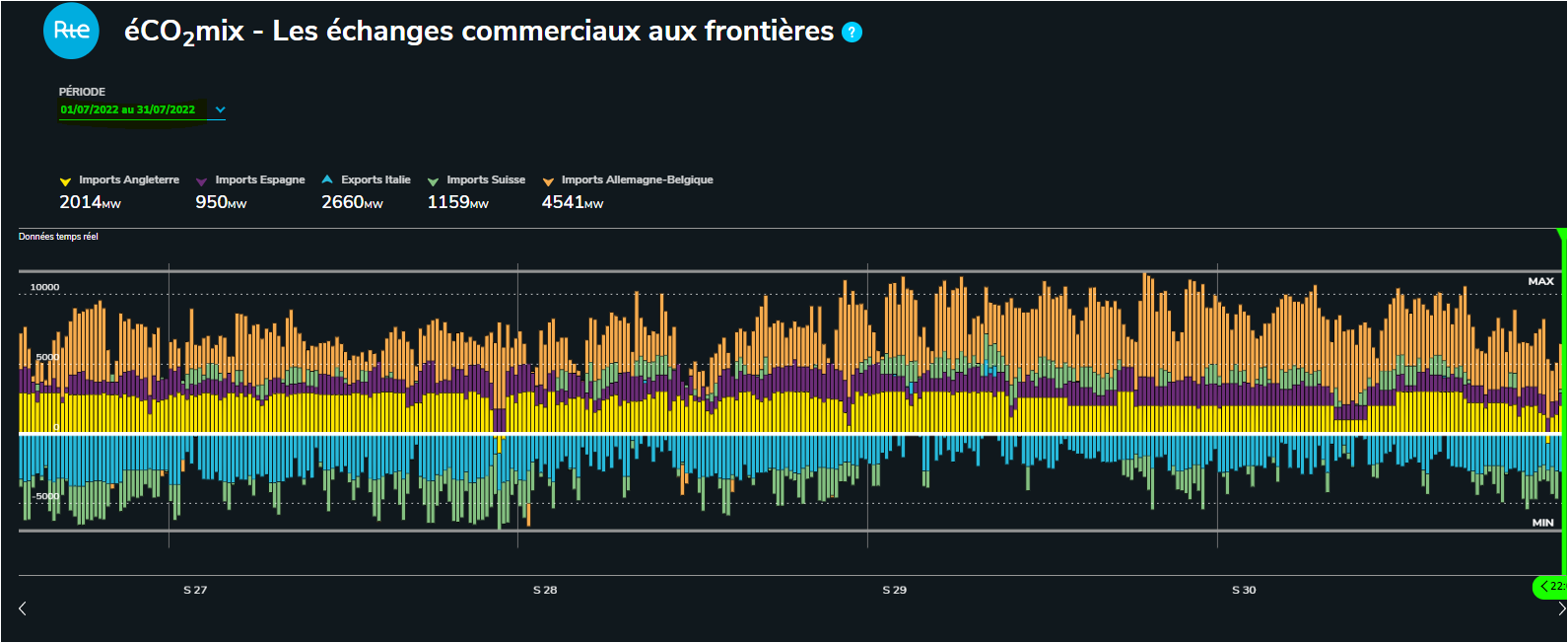 Saldo de importações e exportações de eletricidade da França com os países vizinhos (mês de julho de 2022)