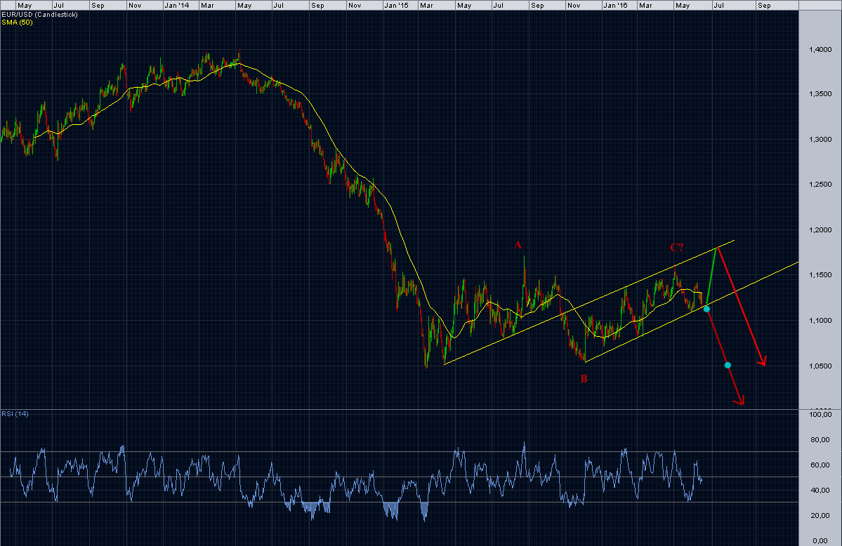 a panorâmica de larga escala continua a apontar para a queda do euro, mas no curto/médio prazo ainda poderá haver "brincadeira". eventualmente poderá haver um culminar com a espectável não saída do UK, subindo o euro a perna que ainda parece faltar. a subida do euro neste momento parece-me traduzir uma apetência pelo risco, que se deverá correlacionar com subida das bolsas.