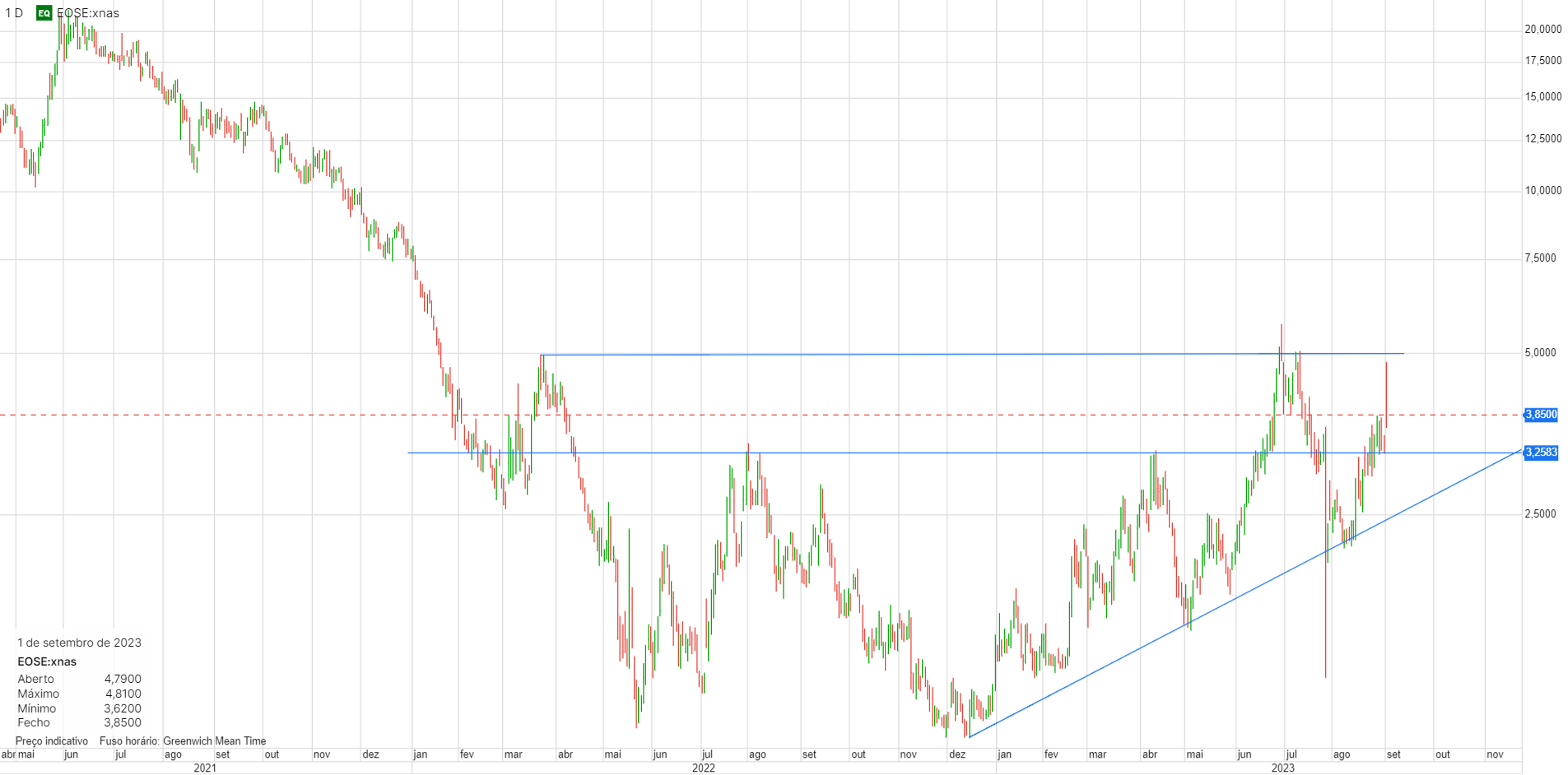 A EOS vai fazendo o seu caminho. A vela de hoje, parece horrorosa, mas subiu 18%, Abriu a ganhar mais de 40%, dai o mau aspeto.