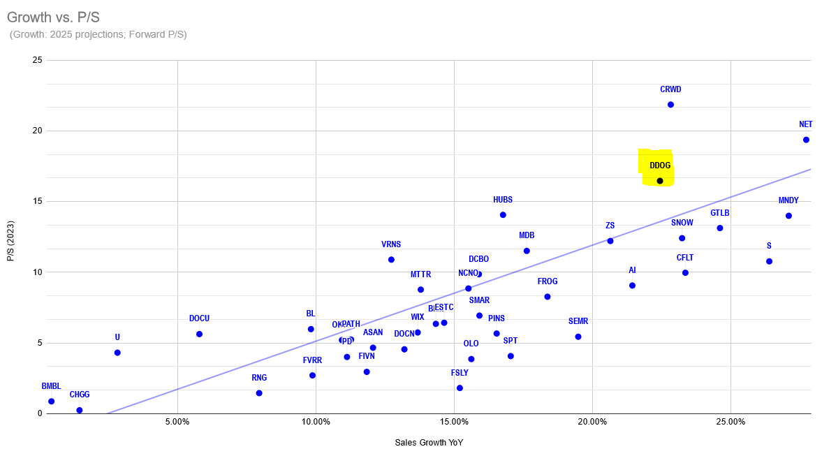 A preços de hoje o EV/S (TTM) é de 3.92, o que é um valor convidativo para uma empresa de cloud com receitas recorrentes. Avaliando a métrica P/S, em termos comparativos, está próximo da OLO e da FSLY empresas com problemas e que apresentam pesados prejuízos ao passo que a BILL apresentou já lucros no último trimestre