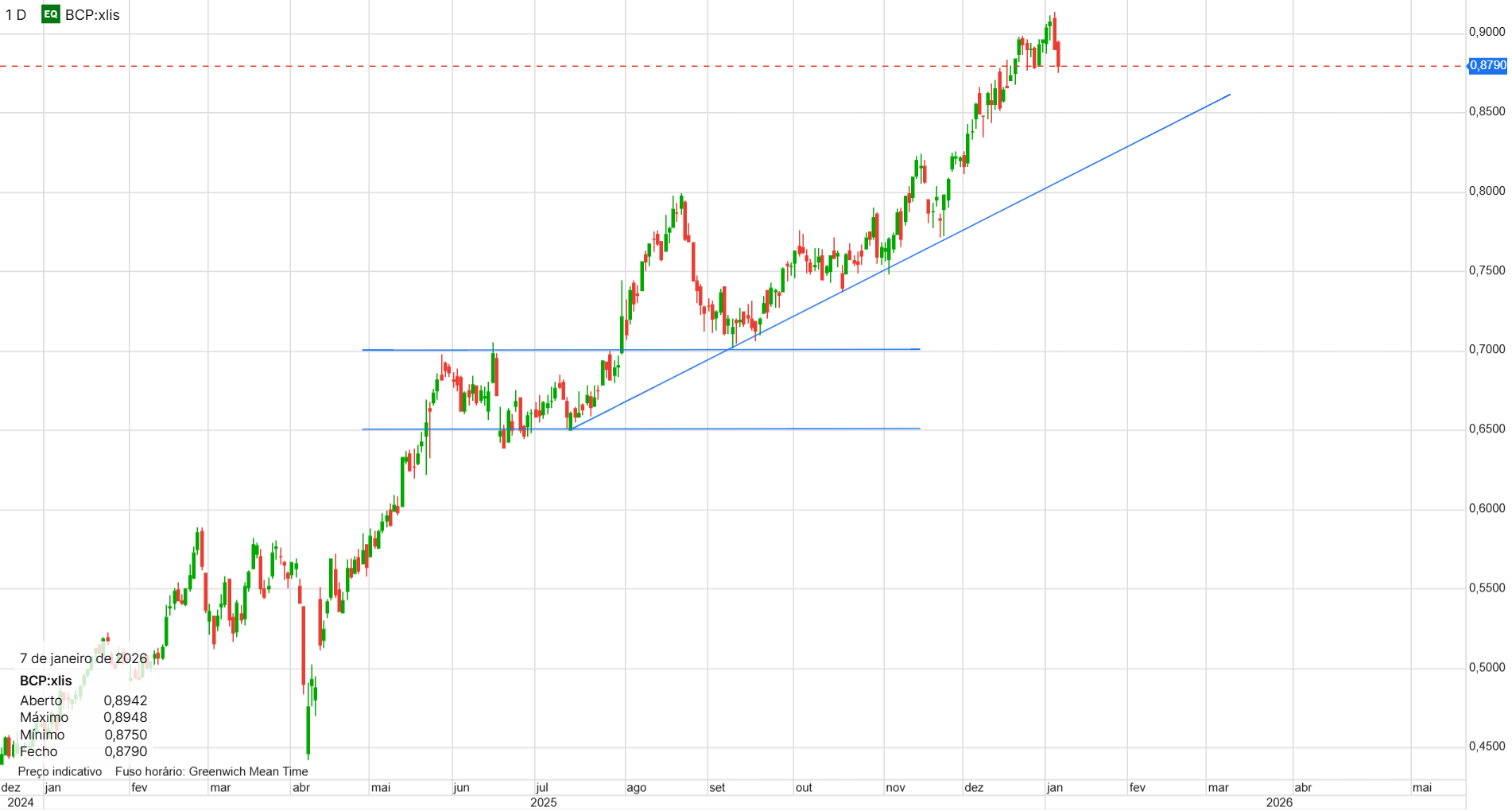 Acredito que o BCP irá atingir o 1€ e até ultrapassar mas para já fico a assistir ao jogo da bancada a aguardar por uma correcção dos mercados.