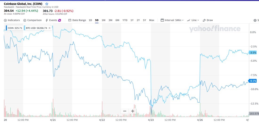 Ver gráfico supra » O que não esperava (e não aprecio nada) nestes seus primeiros 10 dias de transações no Nasdaq é que existisse uma correlação positiva forte entre variações da Bitcoin (1 trilião de $ em ativos) e variações de cotação da Coinba$e, com 60,5 biliões de $ de capitalização (embora com Beta 2,1). Irrita porque não faz parte do Ethos da maior Exchange do Mundo, da maior Consultora de BlockChain para institucionais e Estados federados, da maior custodiante de tokens e de cryptos, do estandarte da nova economia - DA LÍDER DA CRYPTO ECONOMIA ESTÁ A EVOLUIR PARA LÍDER DA ECONOMIA/MONETIZAÇÃO DIGITAL, com alianças operacionais com alguns bancos de investimento e melhores Fundos abertos USA, Japão e Médio Oriente, estar como mero "follower" das cotações de uma só Crypto. Nada mais redutor e absurdo!