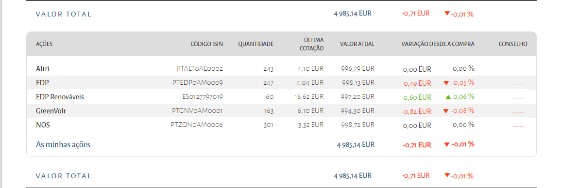 Hoje as ações que desceram mais foram: NOS SGPS SA, Banco Comercial Português SA, Corticeira Amorim SGPS SA, EDP Energias de Portugal SA e GreenVolt.