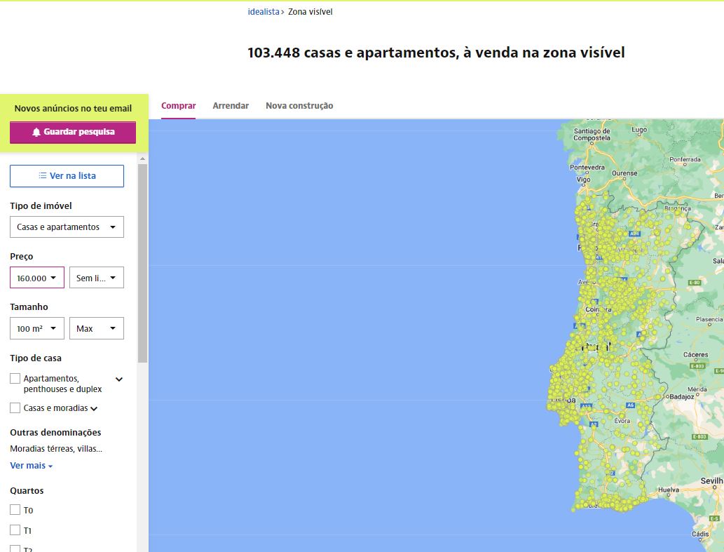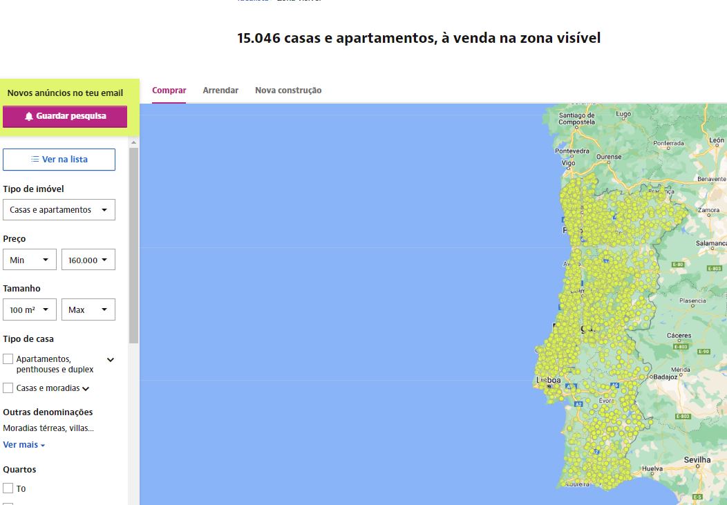 Por exemplo, se a casa tiver 250m2, o teu critério de pesquisa obriga a que a casa custe 640 euros por m2 ou menos para aparecer na tua pesquisa (o que quer dizer que exclui todas as casas para esta área aproximada e que custem entre 640 e 1600 euros por metro quadrado).