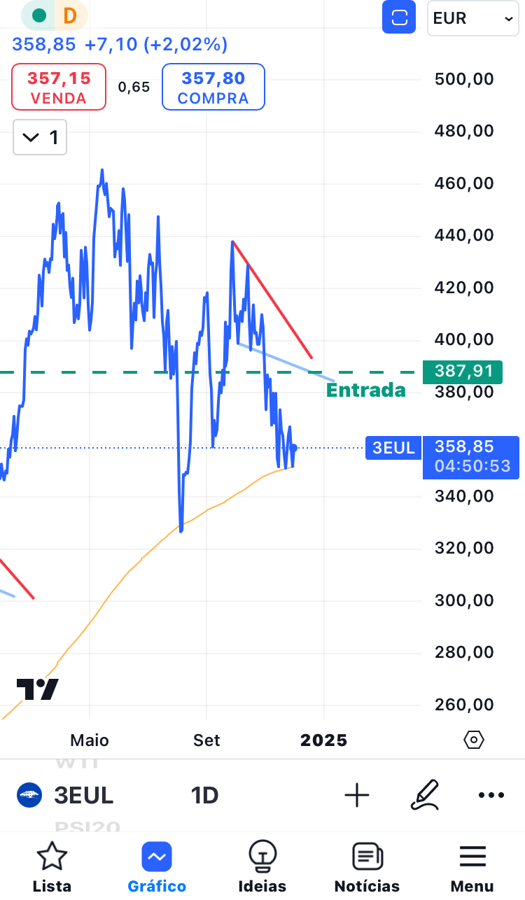 O 3EUL desceu como o EuroStoxx50, mas como é alavancado 3x, a descida foi maior do que a do índice. Ele tem algumas reações na média móvel, e acredito que vai voltar a subir como das outras vezes