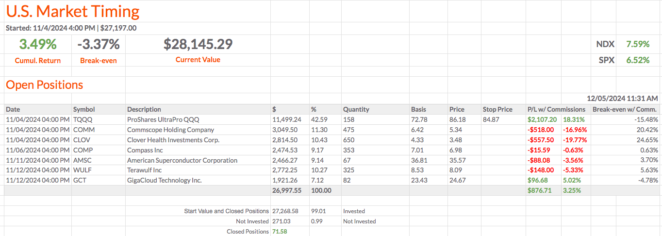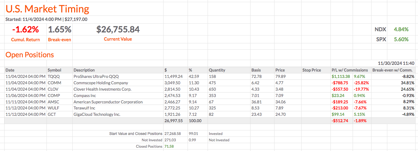 Em 30/11/2024, a carteira estava 6,46% abaixo do NDX (NDX: +4,84%) e 7,22% abaixo do SPX (SPX: +5,60%). Em 06/12/2024, a carteira está 5,94% abaixo do NDX (NDX: +8,31%) e 4,24% abaixo do SPX (SPX: +6,61%).