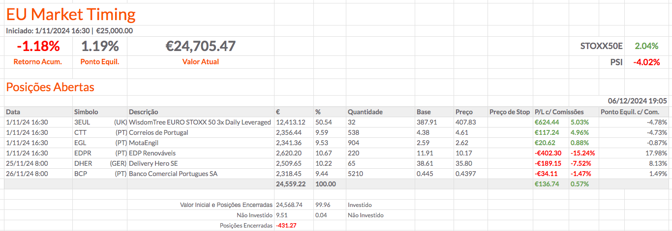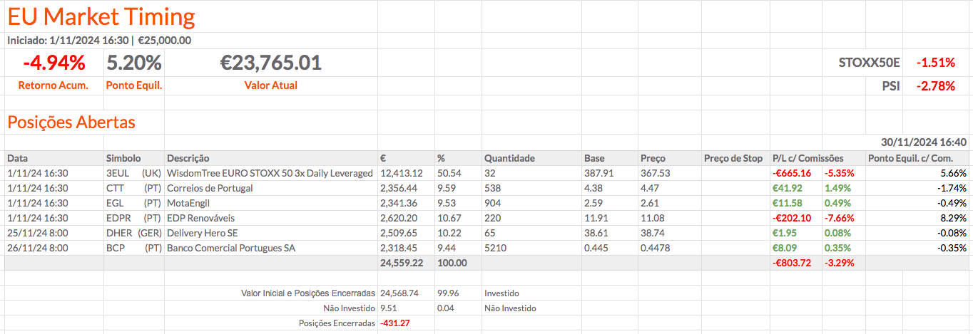 A carteira melhorou 0,60% em relação a 22/11/2024 (de -5,54% para -4,94%). Continua abaixo dos índices de referência, mas a diferença diminuiu 0,31% em relação ao STOXX50E e 0,46% em relação ao PSI. Em 22/11/2024, a carteira estava 3,74% abaixo do STOXX50E (STOXX50E: -1,80%) e 2,62% abaixo do PSI (PSI: -2,92%). Em 30/11/2024, a carteira está 3,43% abaixo do STOXX50E (STOXX50E: -1,51%) e 2,16% abaixo do PSI (PSI: -2,78%).