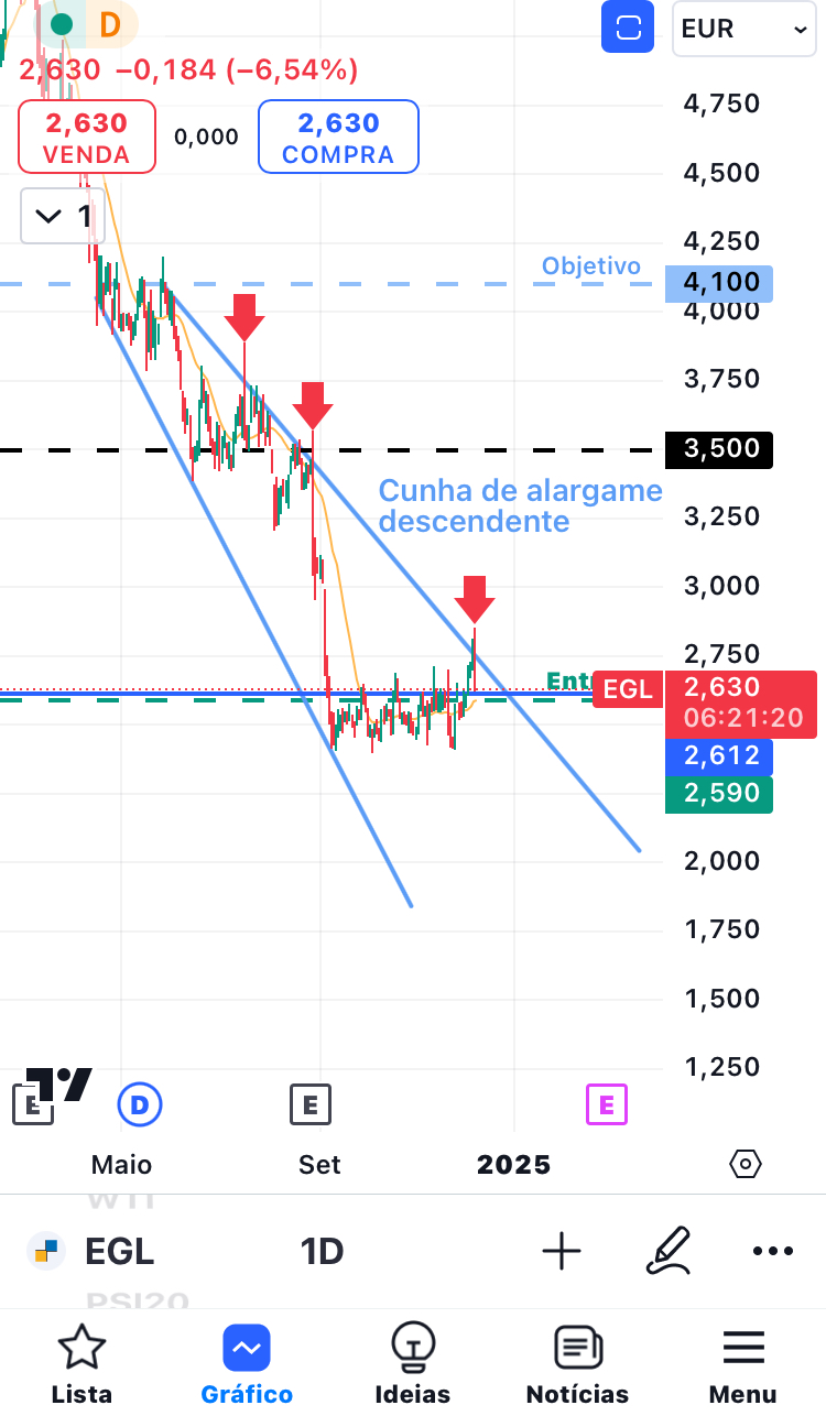 Vou manter a EGL por causa da cunha de alargamento descendente, mas é visível porque ela está a descer hoje: tem descido sempre que fica acima da linha de resistência descendente. Antes, também descia sempre que passava da linha de resistência horizontal (2.612), até que um dia isso deixou de acontecer.