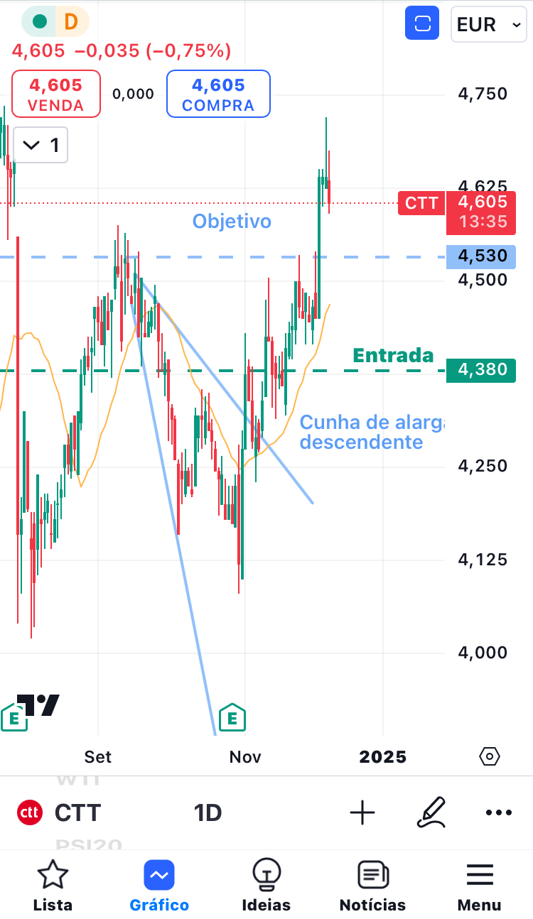 Vou retirar a ação CTT da lista das cunhas, porque já atingiu o objetivo. Vou também adicionar a COR à lista das cunhas.