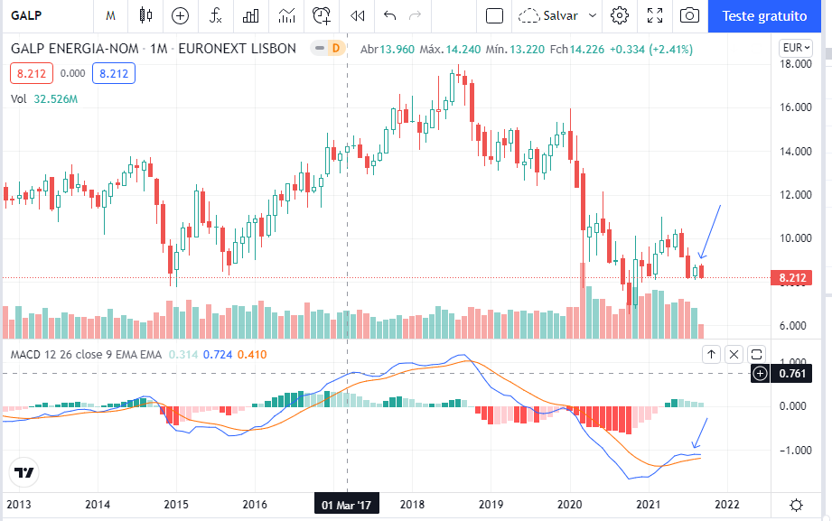 Mas falemos da Galp. Não estava nos meis planos entrar neste setor, mas aquela aproximação a 8.20 fez acender o semáforo que manda comprar. Tomemos o gráfico.