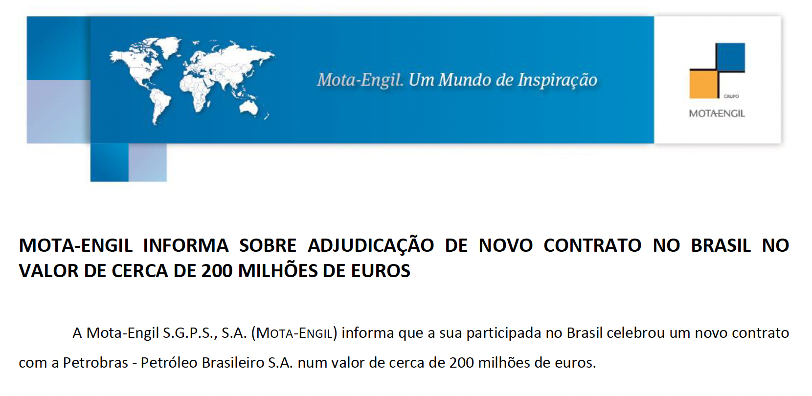 O contrato de 200 M€ comunicado ontem veio juntar-se a outro de 135M€, assinado em junho, mas esse, o dos 135M€, já é notícia com 6 meses (ver notícia de junho no jornal de negócios: Mota-Engil assegura novo contrato de 135 milhões no Brasil)