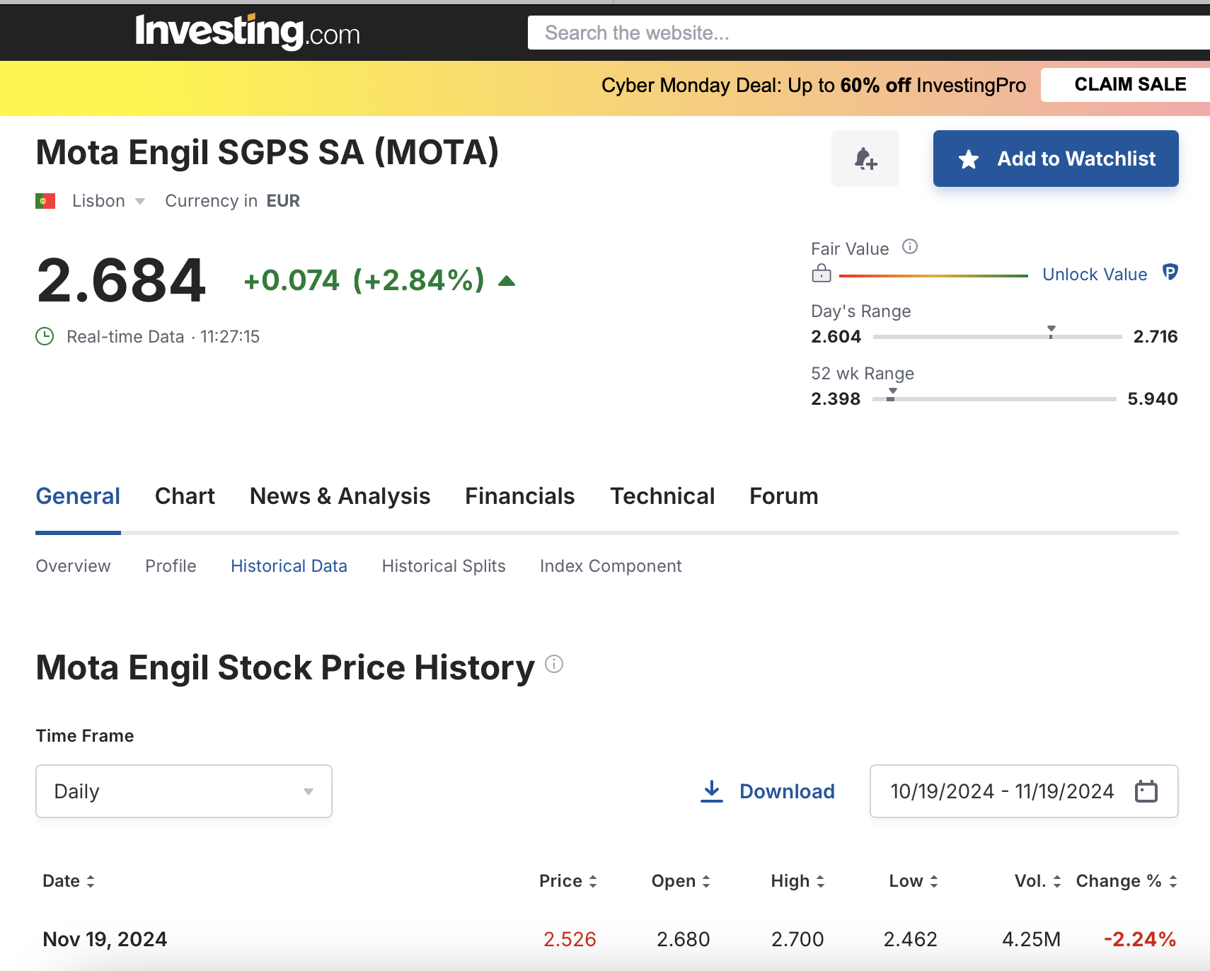 Curiosamente a Mota Engil também raramente teve um fecho abaixo dos 2.479€, o Book Value per Share (valor contabilístico por ação) se considerarmos o Total Equity (total dos capitais próprios) no cálculo do BVS.