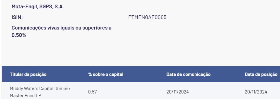 - 1. Eu não disse que o short é de 0.57% do capital social, disse que é sobre "0.57% do capital", subentenda-se capital em bolsa, esse é o jargão oficial que consta no site da CMVM que lista as posições curtas sobre a Mota Engil (ou sobre qualquer outra cotada), conforme printscreen abaixo do site da CMVM: