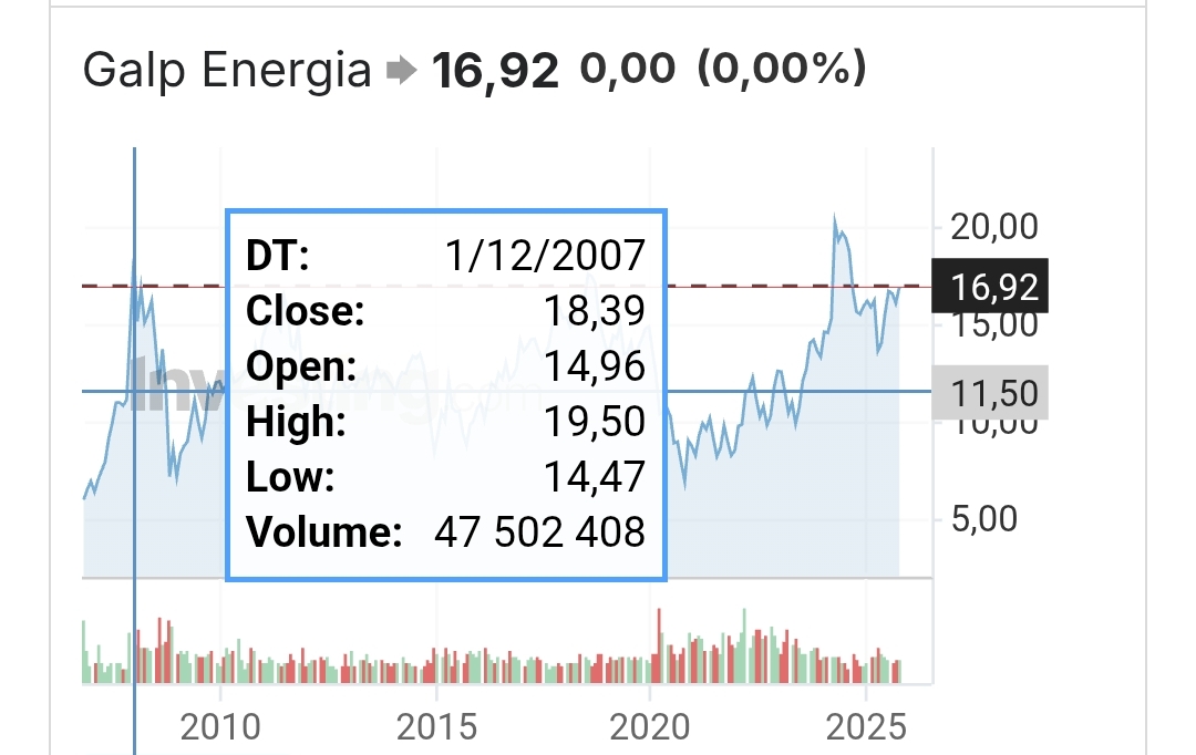 Eu estou investido na Galp e acredito nos >20€ em 12 a 18 meses. No entanto, tenho expetativa de aumentar a posição a um preço significativamente mais baixo que o atual brevemente. Tens a OPEC a falar em aumentar produção, uma potencial desaceleração económica nos US (ex-AI), desvalorização do dólar após novos cortes das taxas do FED, e uma provável resolução do conflito na Ucrânia. Nos últimos dias o Brent subiu sobretudo devido às notícias sobre a Índia deixar de comprar petróleo russo, mas antes disso a trajetória no Brent (e Galp) era de queda.