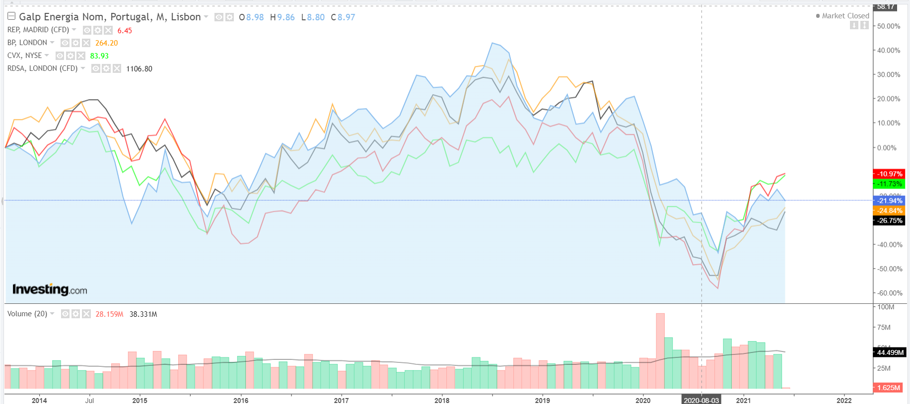 A verdade é que historicamente a GALP não tem um desempenho em bolsa muito diferente de outras empresas petrolíferas. Como se pode ver no gráfico anexo, se tivesses comprado acções da Chevron, Repsol, BP, Royal Shell em 2014, estarias hoje mais ou menos onde estarias se tivesses comprados acções da GALP. E a GALP não se fica atrás em dividendos. Nenhuma destas empresas recuperou ainda os valores pré-pandemia, portanto não é só a GALP que ainda tem escadas para subir. É verdade que por exemplo a Repsol tem tido uma subida mais significativa nestes últimos meses, mas também é verdade que a Repsol desceu mais que a GALP quando a pandemia começou. Portanto, numa perspectiva de longo prazo a GALP continua a ter um comportamento semelhante às empresas do sector.