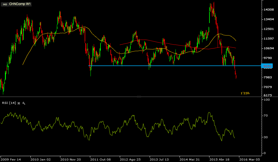O DAX quebrou esta linha de tendência ascendente no semanal. Todavia, encontra-se num suporte. O discurso do Draghi até pode suportar este suporte, no entanto, na minha ótica, não terá voz para aguentá-lo por muito tempo. Aliado a esta análise técnica temos a china, em que o índice acabou de quebrar um suporte importante. Estou de olhos em bico...