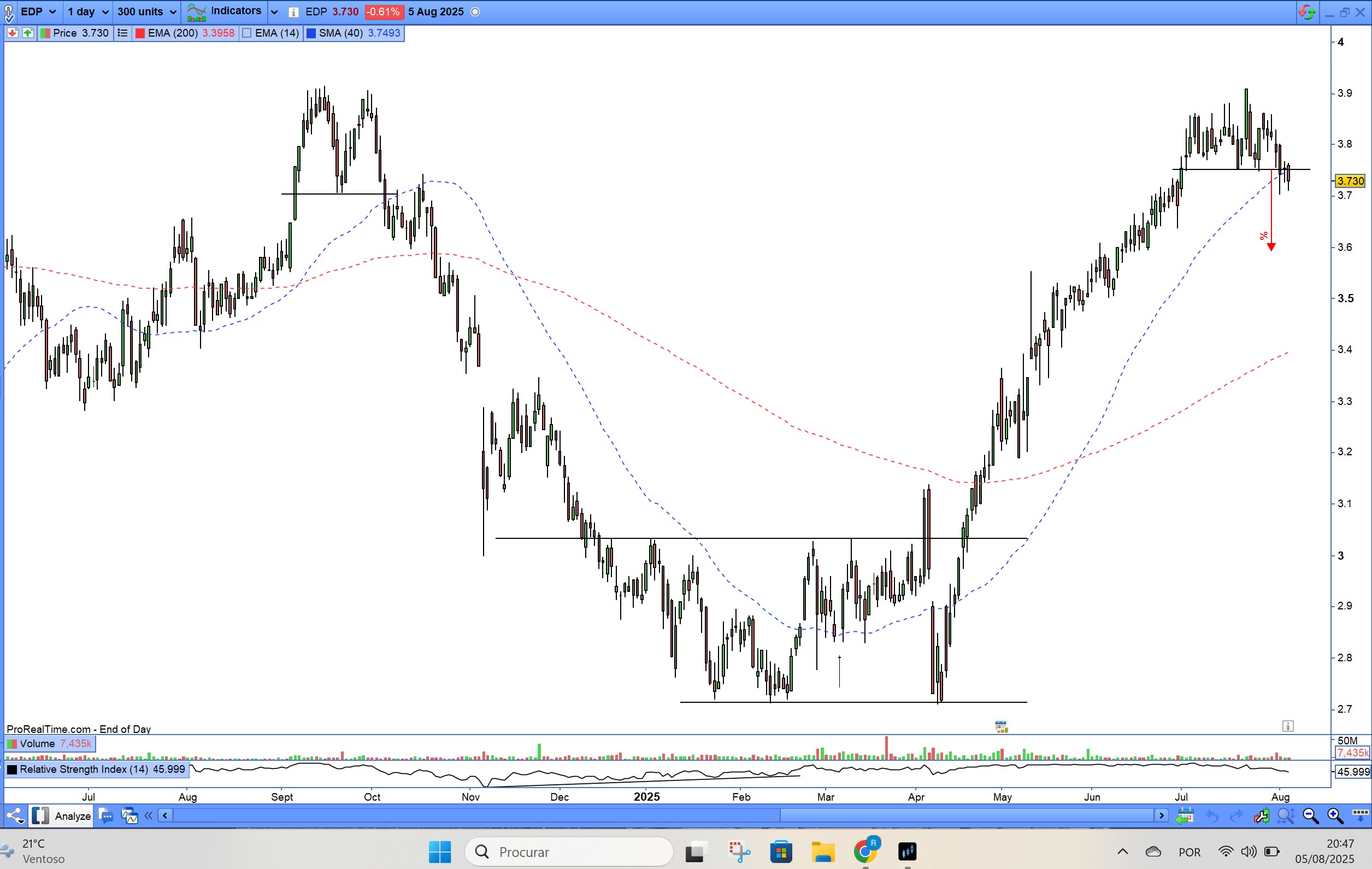 Como mostra o grafico do Yaya, parece estar no topo do canal descendente. Eu vendi cedo demais, pelos 3.500, a pensar que ja tinha chegado a esta ltd, mas agora parece finalmente estar a formar-se um topo "perigoso"