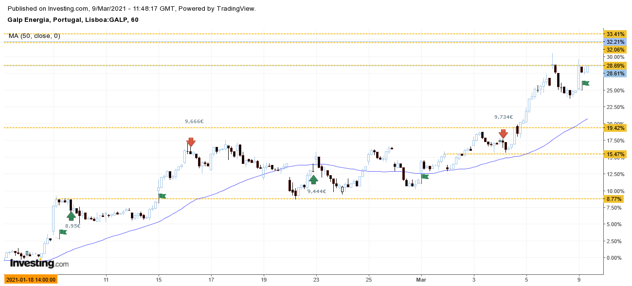 Quanto à Galp, tem um intervalo entre os 10,72€/10,31€, são 5%.